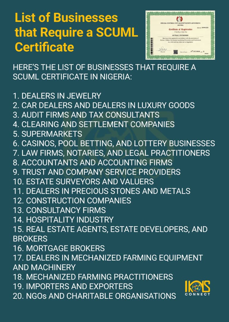 List of Businesses That Require a SCUML Certificate in Nigeria If you run a business in Nigeria that deals with money, assets, property, or financial transactions, you are legally required to obtain a SCUML Certificate. SCUML (Special Control Unit Against Money Laundering) is a regulatory body under the Economic and Financial Crimes Commission (EFCC). Its role is to monitor businesses that are vulnerable...
